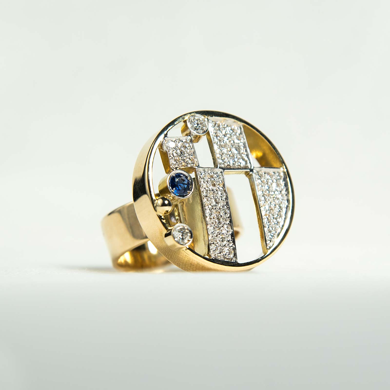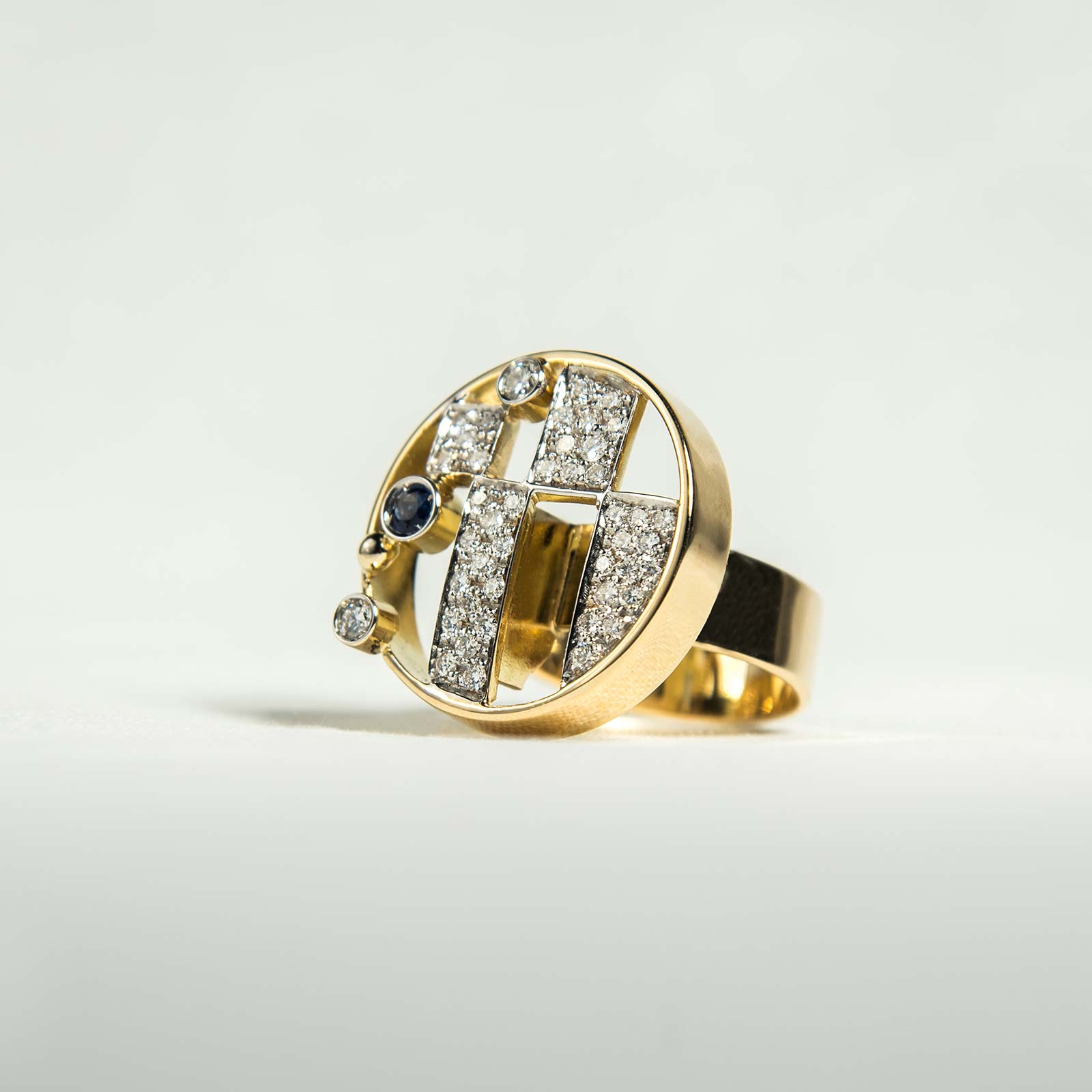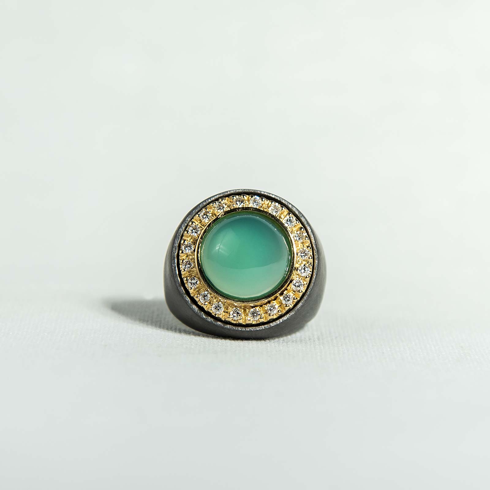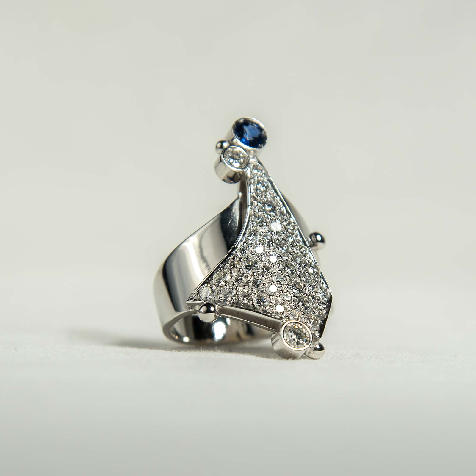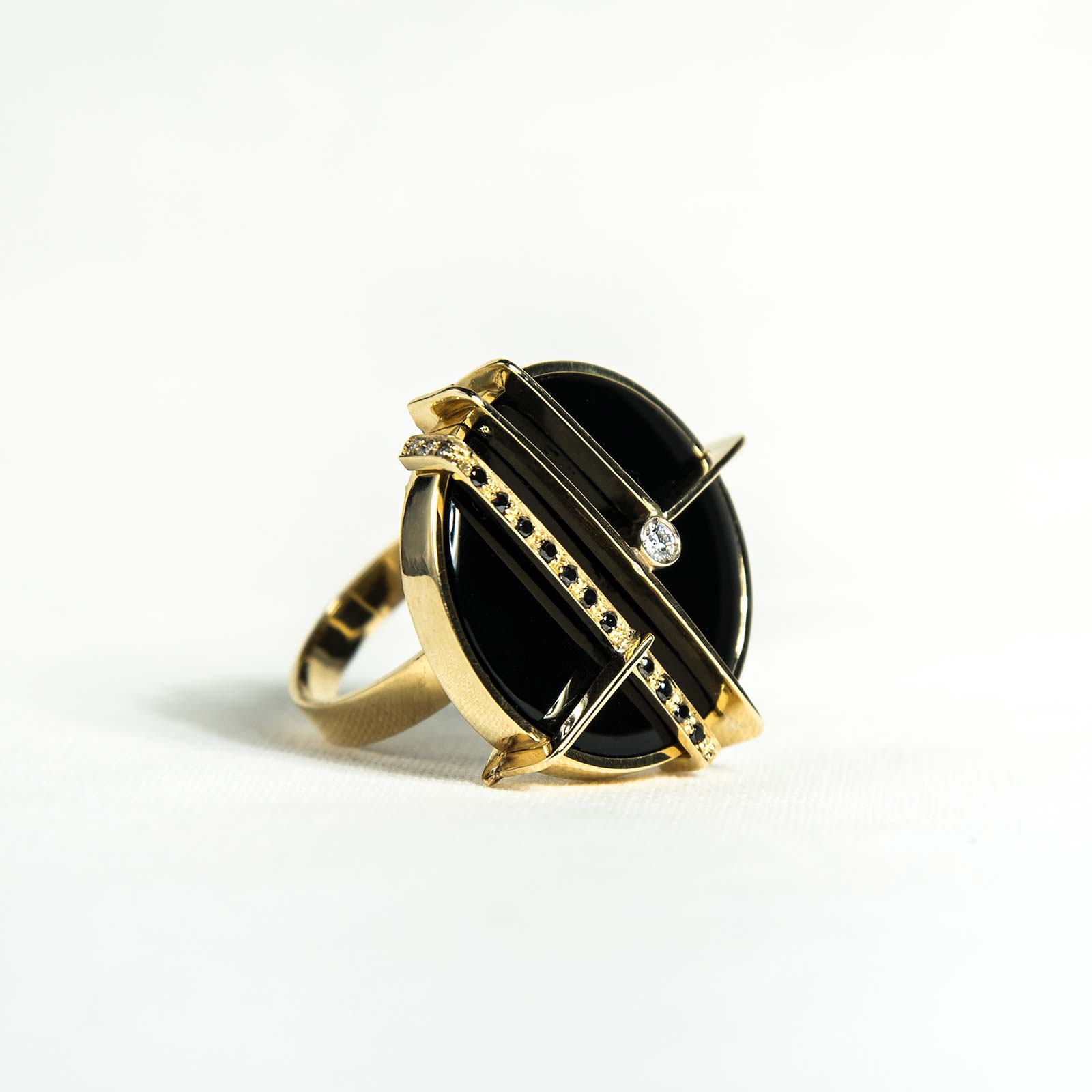 Anello in argento lucido rutenio con dettagli in oro giallo 18Kt e ametista naturale. Un design elegante e contemporaneo che unisce luce, colore e artigianalità.