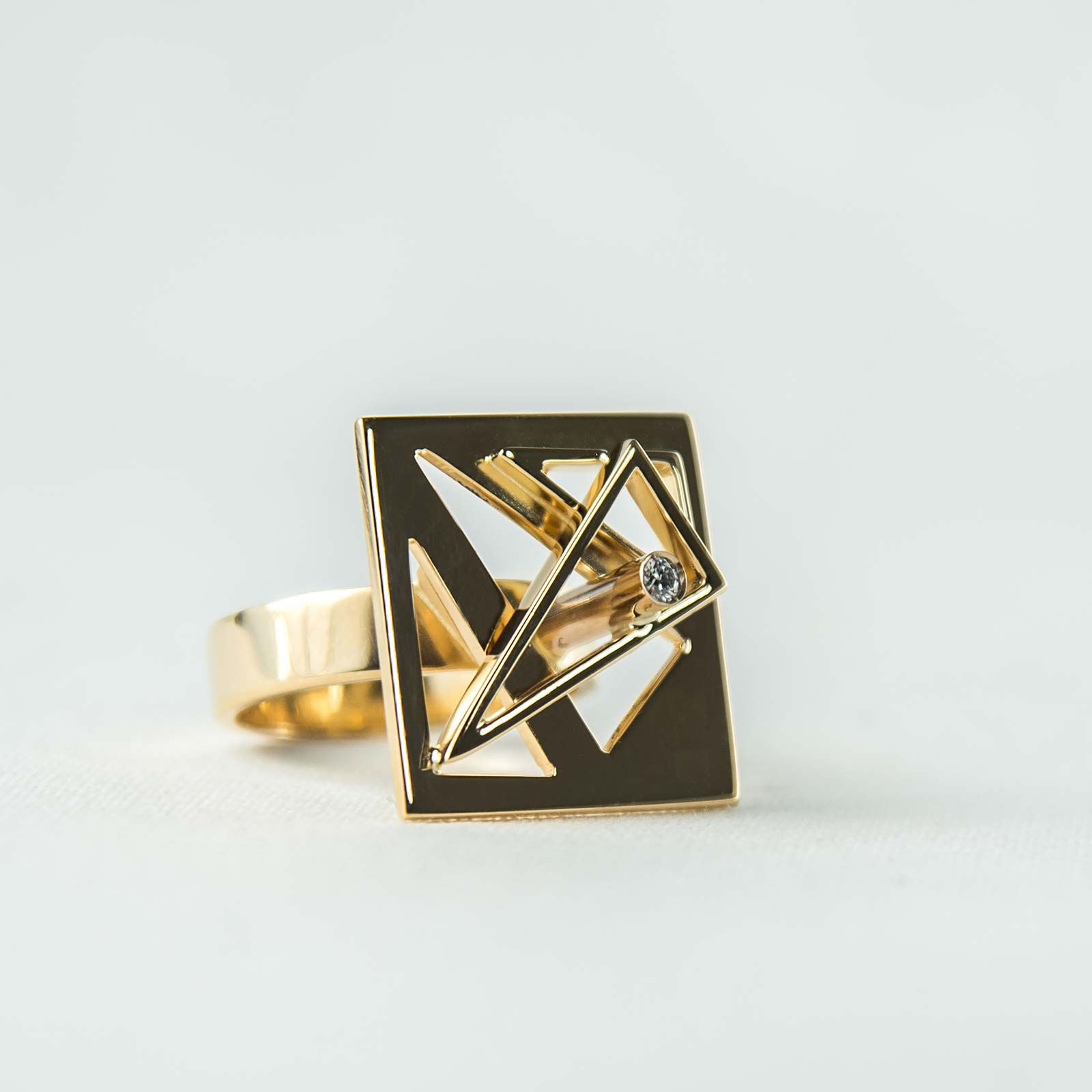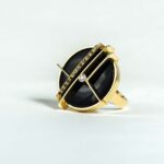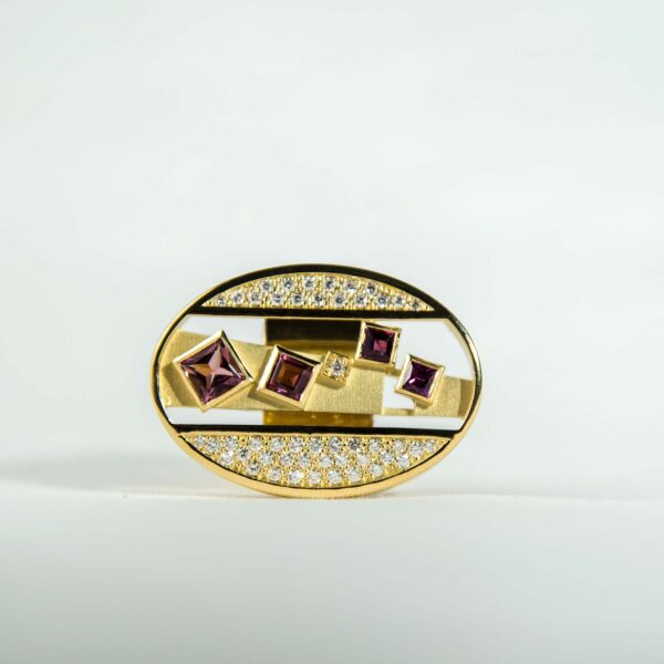 Anello in oro giallo 18Kt con tormaline rosa e brillanti che creano un raffinato equilibrio di luce e colore. Un gioiello dal fascino delicato, realizzato artigianalmente.